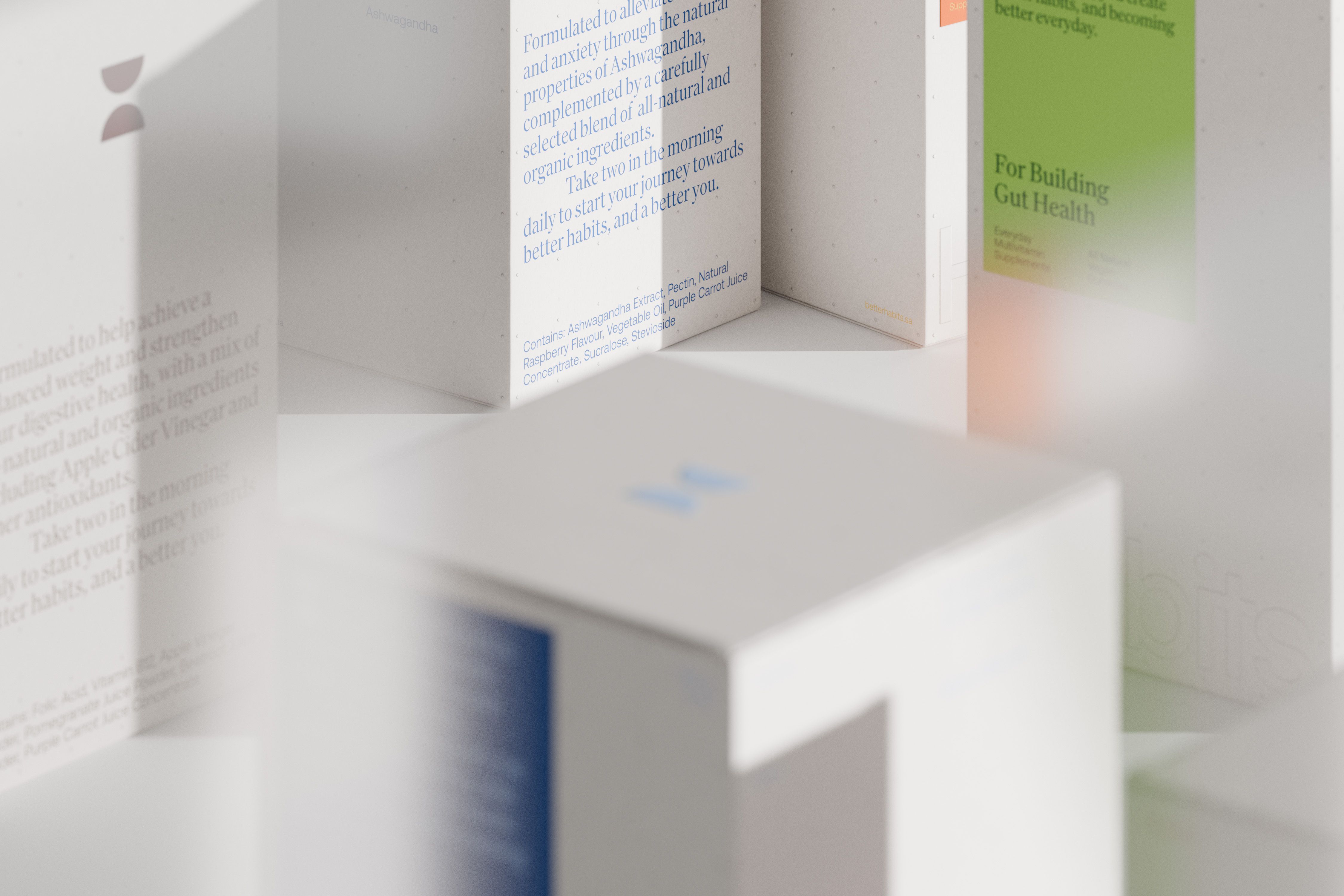 The graphic system uses a dot grid to align the various elements, including a consistent colored label system to highlight the key high-level aspects and ingredients of the supplement. Loosely inspired by beakers and other scientific measurements, the grid creates a mechanical, organized feeling. Contrasting that, the moments of saturated colored blocks overlapping the grid create moments of play.